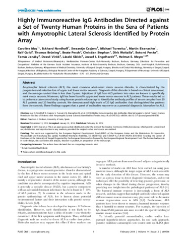 Highly Immunoreactive IgG Antibodies Directed against a Set of Twenty Human Proteins in the Sera of Patients with Amyotrophic Lateral Sclerosis Identified by Protein Array.