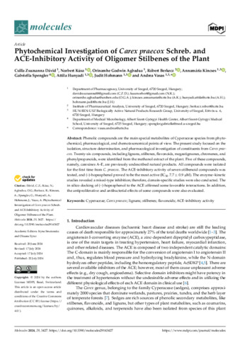 Phytochemical Investigation of Carex praecox Schreb. and ACE-Inhibitory Activity of Oligomer Stilbenes of the Plant.