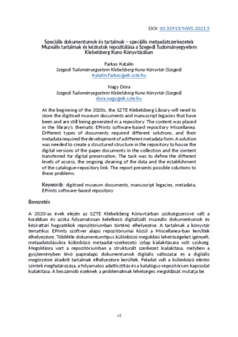 Speciális dokumentumok és tartalmak – speciális metaadatszerkezetek - Muzeális tartalmak és kéziratok repozitálása a Szegedi Tudományegyetem Klebelsberg Kuno Könyvtárában.