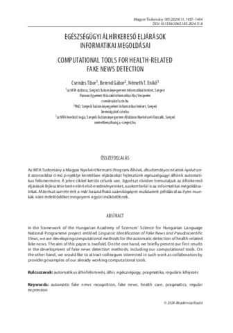 Egészségügyi álhírkereső eljárások informatikai megoldásai [Computational Tools for Health-Related Fake News Detection].