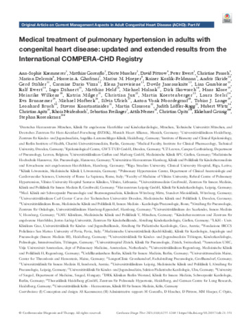 Kaemmerer Ann-Sophie; Gorenflo Matthias; Huscher Doerte; Pittrow David; Ewert Peter; Pausch Christine; Delcroix Marion; Ghofrani Hossein A.; Hoeper Marius M.; Kozlik-Feldmann Rainer; Skride Andris; Staehler Gerd; Vizza Carmine Dario; Jureviciene Elena; Jancauskaite Dovile; Gumbiene Lina; Ewert Ralf; Daehnert Ingo; Held Matthias; Halank Michael; Skowasch Dirk; Klose Hans; Wilkens Heinrike; Milger Katrin; Jux Christian; Koestenberger Martin; Scelsi Laura; Brunnemer Eva; Hofbeck Michael; Ulrich Silvia; Nemes Attila: Medical treatment of pulmonary hypertension in adults with congenital heart disease: updated and extended results from the International COMPERA-CHD Registry.