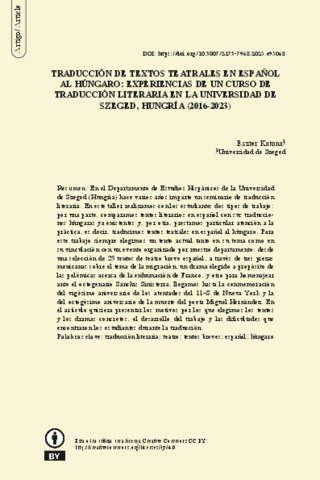 Traducción de textos teatrales en español al húngaro: experiencias de un curso de traducción literaria en la Universidad de Szeged, Hungría (2016-2023) [Translation of spanish theatrical texts into hungarian. Experiences of a literary translation course at the University of Szeged (2016-2023)].