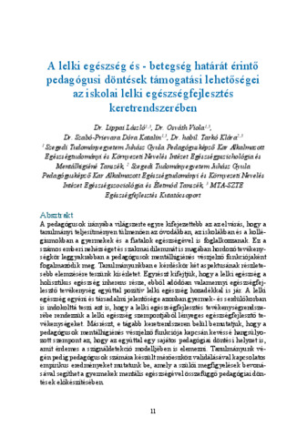 A lelki egészség és - betegség határát érintő pedagógusi döntések támogatási lehetőségei az iskolai lelki egészségfejlesztés keretrendszerében.