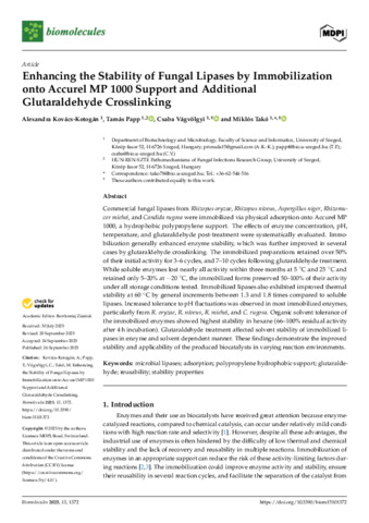 Enhancing the Stability of Fungal Lipases by Immobilization onto Accurel MP 1000 Support and Additional Glutaraldehyde Crosslinking.
