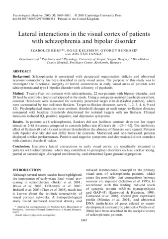 Lateral interactions in the visual cortex of patients with schizophrenia and bipolar disorder.
