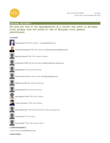 Kurpas Donata; Petrazzuoli Ferdinando; Szwamel Katarzyna; Randall-Smith Jane; Blahova Beata; Dumitra Gindrovel; Javorská Kateřina; Mohos András; Simões José Augusto; Tkachenko Victoria; Kern Jean-Baptiste; Holland Carol; Gwyther Holly: The pros and cons of the implementation of a chronic care model in European rural primary care: the points of view of European rural general practitioners.