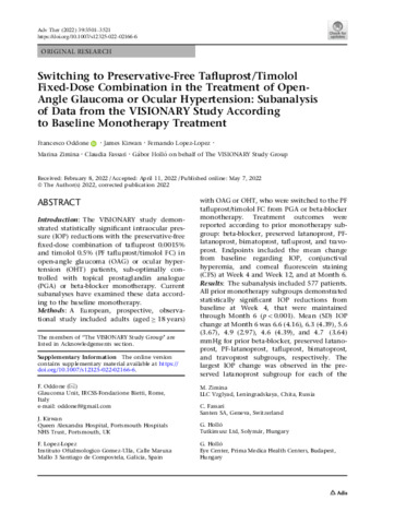 Switching to Preservative-Free Tafluprost/Timolol Fixed-Dose Combination in the Treatment of Open-Angle Glaucoma or Ocular Hypertension: Subanalysis of Data from the VISIONARY Study According to Baseline Monotherapy Treatment.