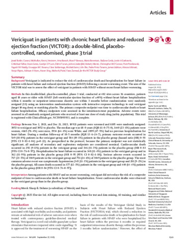 Vericiguat in patients with chronic heart failure and reduced ejection fraction (VICTOR): a double-blind, placebo-controlled, randomised, phase 3 trial.