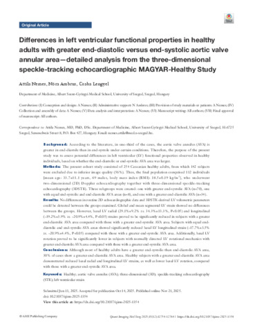 Differences in left ventricular functional properties in healthy adults with greater end-diastolic versus end-systolic aortic valve annular area—detailed analysis from the three-dimensional speckle-tracking echocardiographic MAGYAR-Healthy Study.