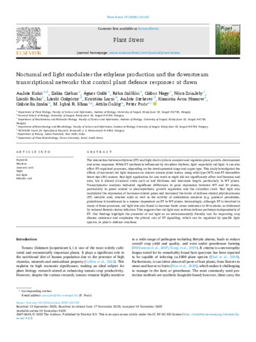 Nocturnal red light modulates the ethylene production and the downstream transcriptional networks that control plant defence responses at dawn.