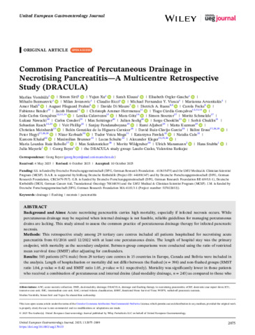 Vornhülz Marlies; Sirtl Simon; Xu Yujun; Klauss Sarah; Orgler-Gasche Elisabeth; Bezmarevic Mihailo; Jovanovic Milan; Ricci Claudio; Fernandez Y Viesca Michael; Arvanitakis Marianna; Hadi Amer; Prahm August Pilegaard; Di Mauro Davide; Ruess Dietrich A; Focke Carola; Bender Fabienne; Hamm Jacob; Ammer-Herrmenau Christoph; Gonçalves Tiago Cúrdia; Gonçalves João Carlos; Calavrezos Lenika; Götz Mara; Stoerzer Simon; Schmelzle Moritz; Nawacki Łukasz; Condori Carlos; Seitzinger Max; Seelig Julian; Chooklin Serge; Chuklin Serhii; Erőss Bálint Mihály; Hegyi Péter; Kollaborációs szervezet: DRACULA study group; Czakó László; et al.: Common Practice of Percutaneous Drainage in Necrotising Pancreatitis-A Multicentre Retrospective Study (DRACULA).