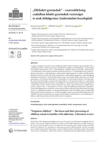 Kassai Szilvia; Békési Tímea; Mucsi Georgina; Jancsák Csaba: „Elfeledett gyermekek” – szenvedélybeteg családban felnőtt gyermekek veszteségei és azok feldolgozása: Szakirodalmi összefoglaló [“Forgotten children” – The losses and their processing of children raised in families with addiction: A literature review].