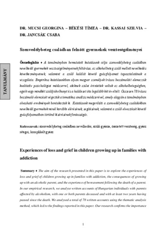 Mucsi Georgina; Békési Tímea; Kassai Szilvia; Jancsák Csaba: Szenvedélybeteg családban felnőtt gyermekek veszteségélményei.