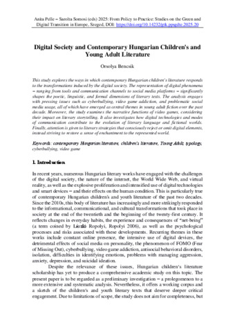 Digital Society and Contemporary Hungarian Children's and Young Adult Literature.