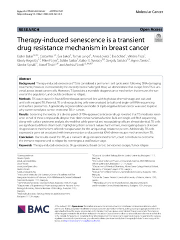 Bajtai Eszter; Kiss Csaba; Bakos Éva; Langó Tamás; Lovrics Anna; Schád Éva; Tisza Viktoria; Hegedűs Károly; Fürjes Péter; Szabó Zoltán; Tusnády Gábor; Szakács Gergely; Tantos Ágnes; Spisák Sándor; Tóvári József; Füredi András: Therapy-induced senescence is a transient drug resistance mechanism in breast cancer.