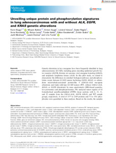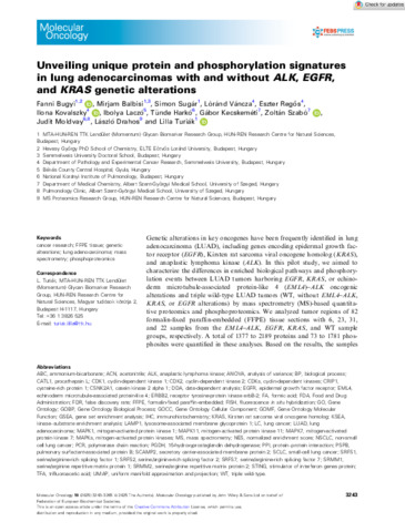 Bugyi Fanni; Balbisi Mirjam; Sugár Simon; Váncza Lóránd; Regős Eszter; Kovalszky Ilona; Laczó Ibolya; Harkó Tünde; Kecskeméti Gábor; Szabó Zoltán; Moldvay Judit; Drahos László; Turiák Lilla: Unveiling unique protein and phosphorylation signatures in lung adenocarcinomas with and without ALK, EGFR, and KRAS genetic alterations.