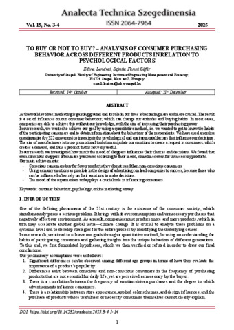 Lendvai Edina; Szintia Fanni Sáfár: To Buy or Not To Buy?. Analysis of Consumer Purchasing Behavior across Different Products in Relation to Psychological Factors.