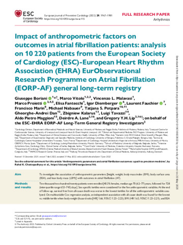 Impact of anthropometric factors on outcomes in atrial fibrillation patients : analysis on 10 220 patients from the European Society of Cardiology (ESC)-European Heart Rhythm Association (EHRA) EurObservational Research Programme on Atrial Fibrillation (EORP-AF) general long-term registry.