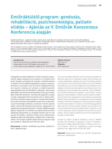Emlőráktúlélő program: gondozás, rehabilitáció, pszichoonkológia, palliatív ellátás – Ajánlás az V. Emlőrák Konszenzus Konferencia alapján.