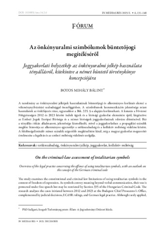 Az önkényuralmi szimbólumok büntetőjogi megítéléséről: Joggyakorlati helyzetkép az önkényuralmi jelkép használata tényállásról, kitekintve a német büntető törvénykönyv koncepciójára.
