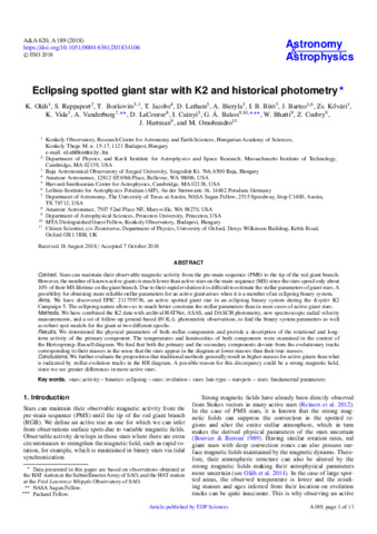 Oláh Katalin Ilona; Rappaport S.; Borkovits Tamás; Jacobs T.; Latham D.; Bieryla A.; Bíró Imre Barna; Bartus J.; Kővári Zsolt; Vida Krisztián; Vanderburg A.; LaCourse D.; Csányi István; Bakos Gáspár; Bhatti W.; Csubry Z.; Hartman J.; Omohundro M.: Eclipsing spotted giant star with K2 and historical photometry.