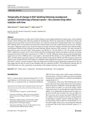 Ferenczi Ádám; Lantos Tamás; Cserni Gábor: Temporality of change in Ki67 labelling following neoadjuvant systemic chemotherapy of breast cancer—the common drop often subsides with time.