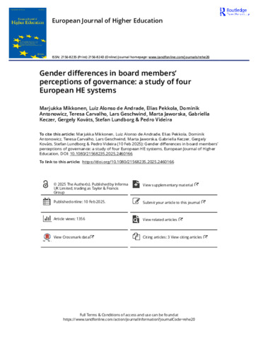 Mikkonen Marjukka; Alonso de Andrade Luiz; Pekkola Elias; Antonowicz Dominik; Carvalho Teresa; Geschwind Lars; Jaworska Marta; Keczer Gabriella; Kováts Gergely Ferenc; Lundborg Stefan; Videira Pedro: Gender differences in board members’ perceptions of governance: a study of four European HE systems.