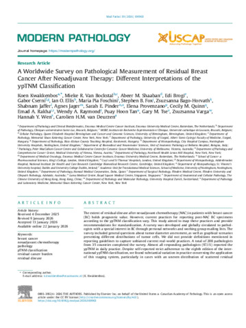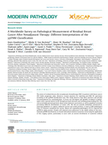 Kwakkenbos Koen; Van Bockstal Mieke R.; Shaaban Abeer M.; Brogi Edi; Cserni Gábor; Ellis Ian O.; Foschini Maria Pia; Fox Stephen B.; Bago-Horvath Zsuzsanna; Jaffer Shabnam; Jager Agnes; Pinder Sarah E.; Provenzano Elena; Quinn Cecily M.; Rakha Emad A.; Raymond Wendy A.; Tan Puay Hoon; Tse Gary M.; Varga Zsuzsanna; Wen Hannah Y.; van Deurzen Carolien H. M.: A Worldwide Survey on Pathological Measurement of Residual Breast Cancer After Neoadjuvant Therapy: Different Interpretations of the ypTNM Classification.