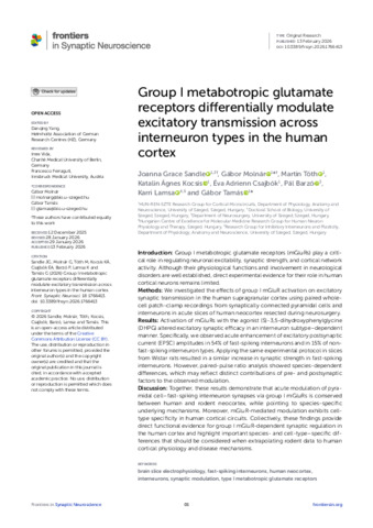 Group I metabotropic glutamate receptors differentially modulate excitatory transmission across interneuron types in the human cortex.