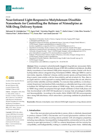 Abdelghafour Mohamed M.; Imre-Deák Ágota; Amin Keristina; Czimer Zsófia; Veronika Czike Flóra; Péter Viktória; Berkecz Róbert; Bari Ferenc; Janovák László: Near-Infrared Light-Responsive Molybdenum Disulfide Nanosheets for Controlling the Release of Nimodipine as NIR-Drug Delivery System.