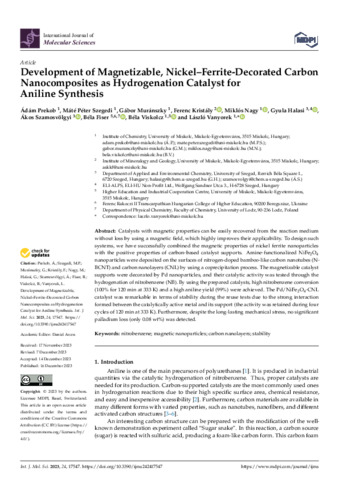 Prekob Ádám; Szegedi Máté Péter; Muránszky Gábor; Kristály Ferenc; Nagy Miklós; Halasi Gyula; Szamosvölgyi Ákos; Fiser Béla; Viskolcz Béla; Vanyorek László: Development of Magnetizable, Nickel–Ferrite-Decorated Carbon Nanocomposites as Hydrogenation Catalyst for Aniline Synthesis.